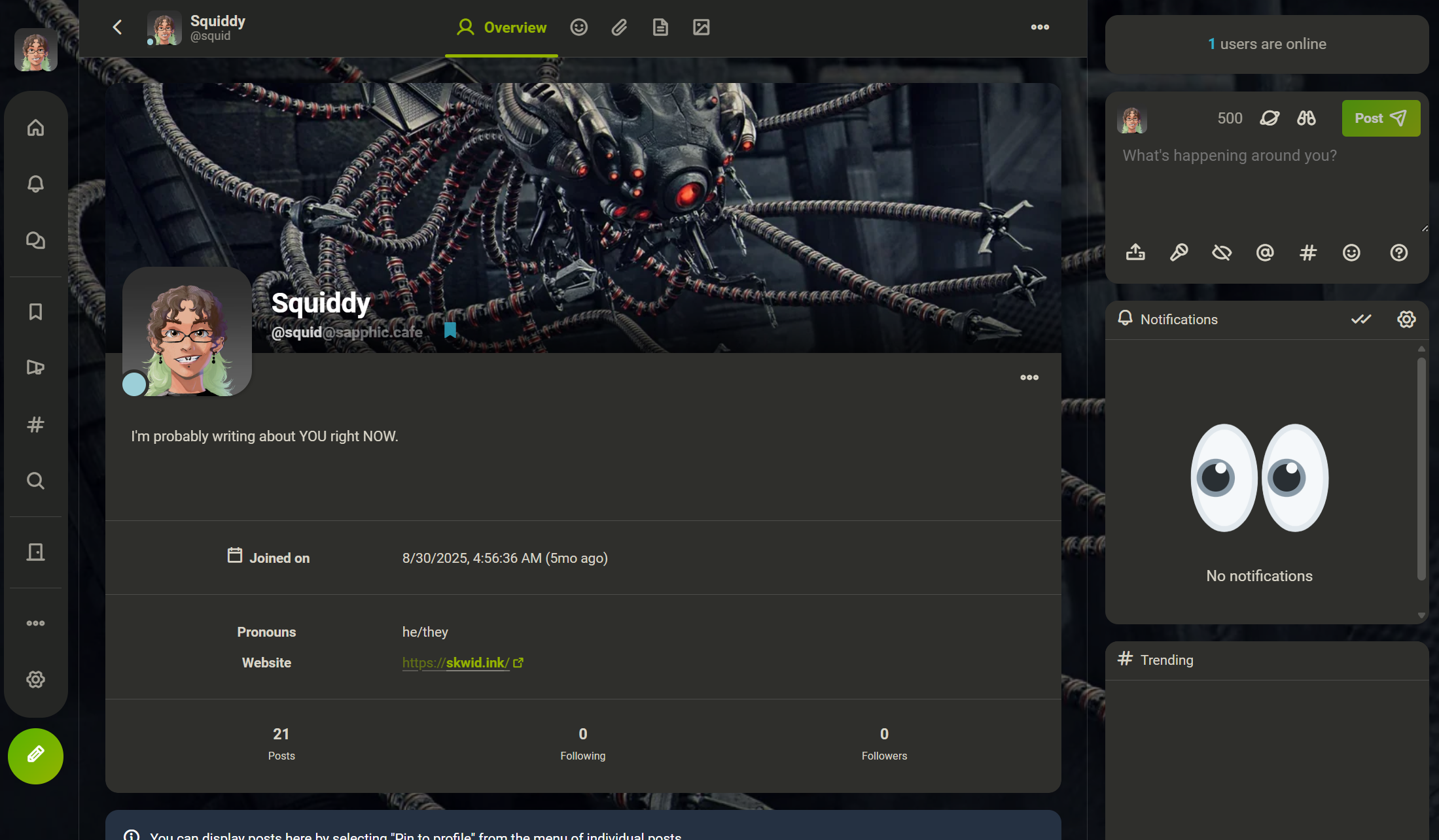 The server is currently private; you have to be logged in to interact with users or to even view user profiles and read posts. There is a possibility in the future of the site being made public if the userbase asks for it. This means that sapphic.cafe will have the ability to interact with countless other social media platforms that are part of the Fediverse, including other LGBTQ+ servers. This will require a hefty blocklist to ensure that our users are not targeted by platforms dedicated to exclusively spreading hate.