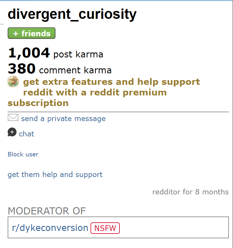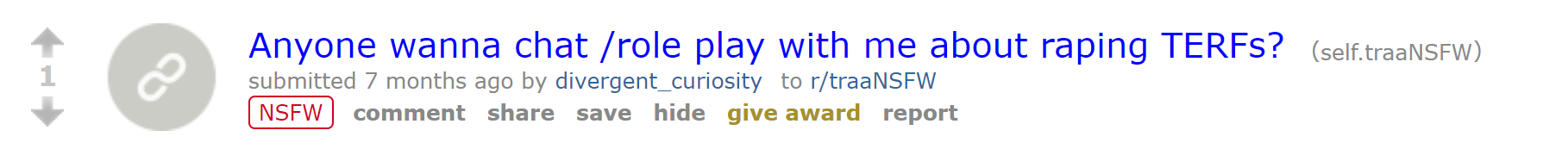 The creator of the subreddit is a bisexual trans man who used the alias “divergent_curiosity” and previously identified as a lesbian woman. They also posted about their fantasy of raping radical feminists they called TERFs.