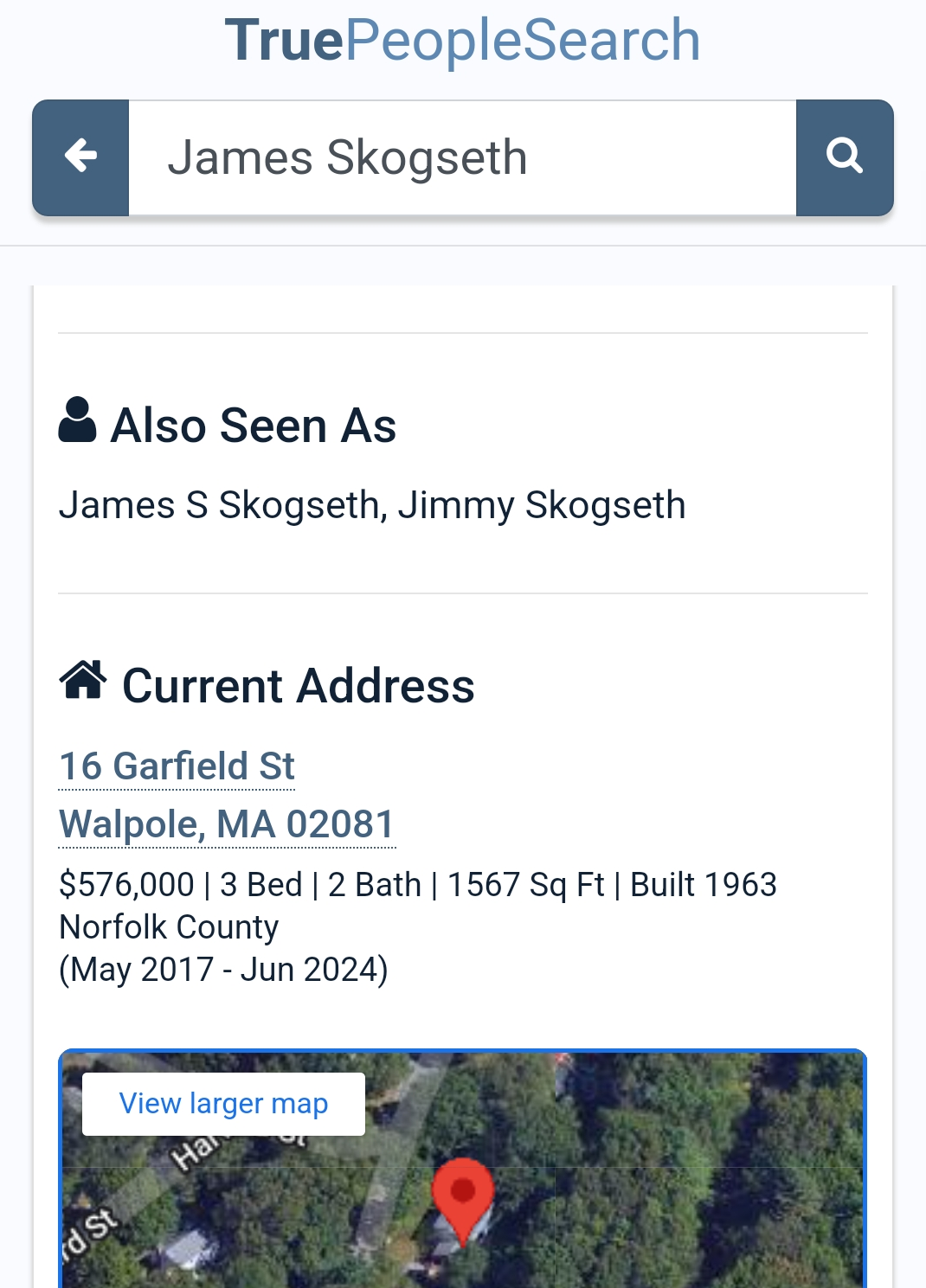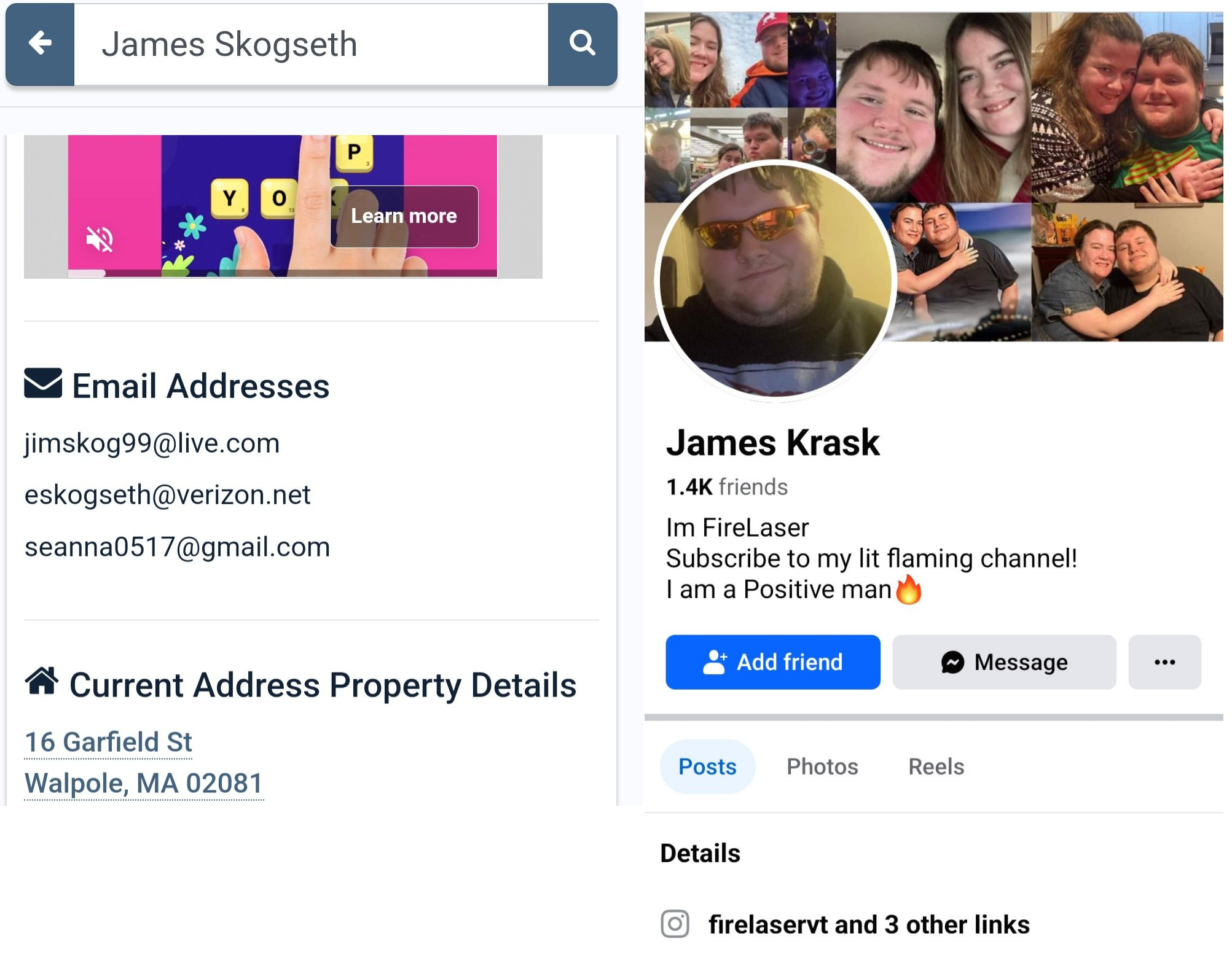 The details shared by jimskog99 match up with people-search site info on James Krask, older reddit profile content matches up with the Facebook account content of James/Kia. The mother of James is FB friends with “Kianna” and there’s so much more evidence. Including a short posted on JimSkog99’s Youtube account. The house on display in the short matches the Google Maps image of the house listed as the current address for James Krask on TruePeopleSearch. According to online property records for Norfolk county, the house belongs to the Skogseth family.