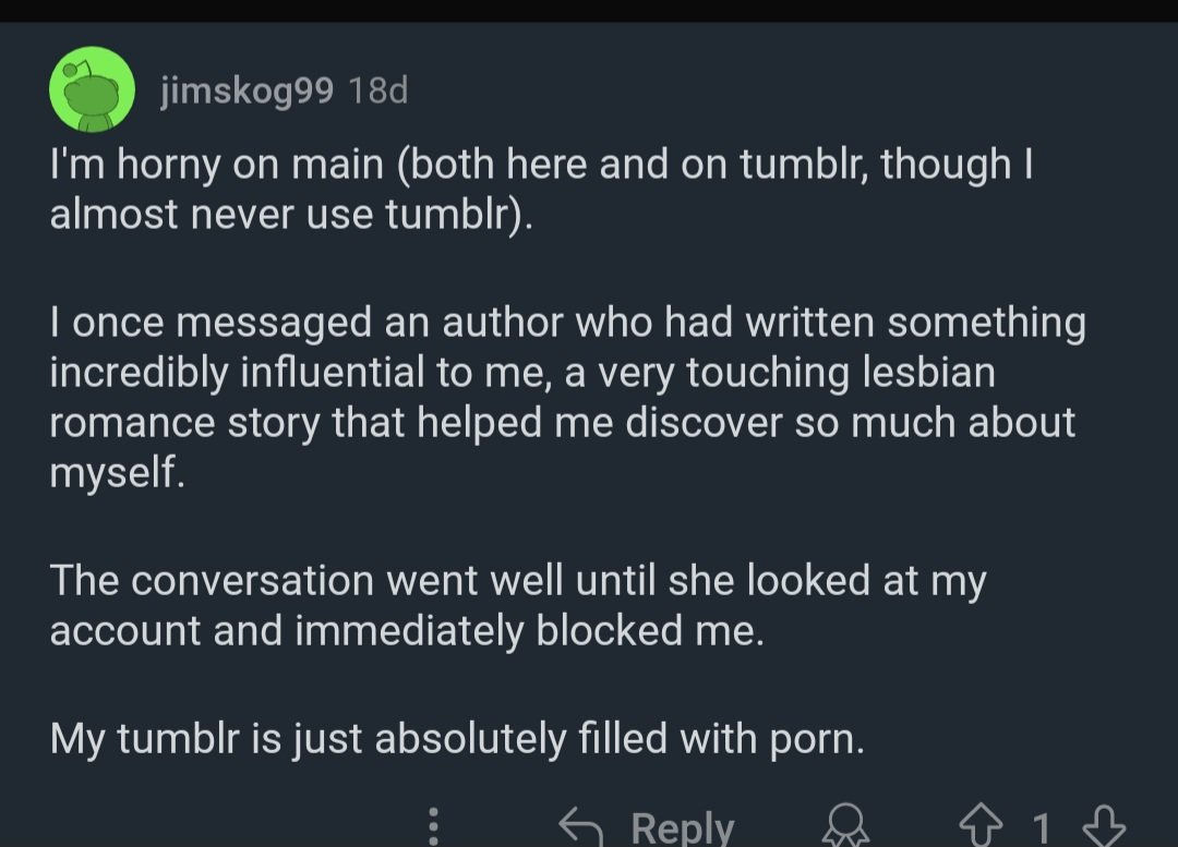 Krask openly admits to being a porn-addict, and to messaging an author of a “very touching lesbian story” on Tumblr, who then blocked Krask after discovering his porn-filled Tumblr account. Something Krask seems to find funny. He also admits to exposing his 11-year-old brother to porn when he, krask, was a teen.