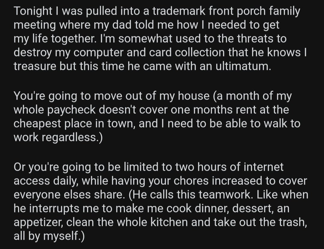 Like many incels, James blames his parents for making him get a job and forcing him to be a responsible adult, and for taking away his internet and Yu-Gi-Oh cards. He hides behind his Autism diagnosis and deems his parents abusive for encouraging him to go offline to take care of his chores. Like many white trans women with an incel past (and there are many), he found time to bash feminists in an MRA (men’s rights) subreddit.