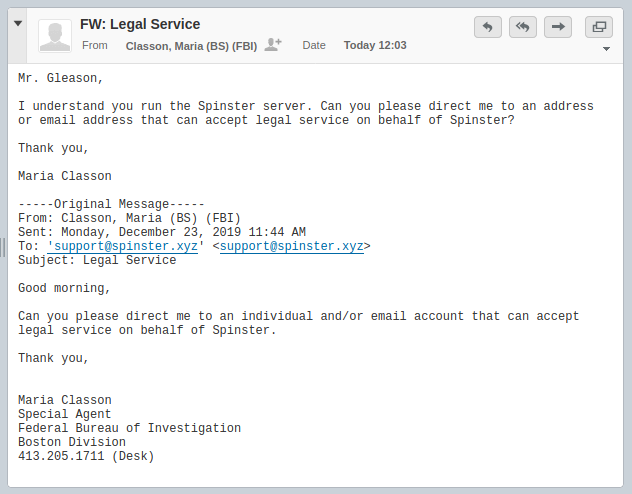 On December 23rd, 2019, Alex Gleason, admin of Spinster.xyz, received Email correspondence from the Federal Bureau of Investigations (FBI) requesting user data (receipt 2, 3). Gleason disclosed this information in Spinster Tech, an unsecured tech chat open to the public to join, regardless of the fact that he had previously warned users of the tech chat that correspondence in the channel was to be considered unsecured (receipt 1).