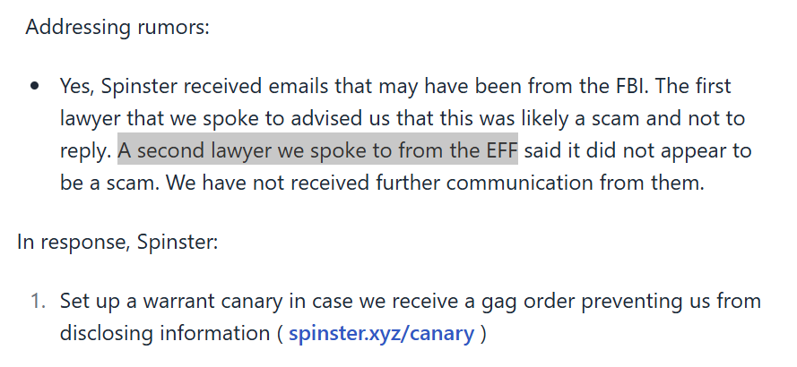 EDIT: As of 2022, Spinster’s warrant canary has not been updated: https://archive.ph/JY0Mf