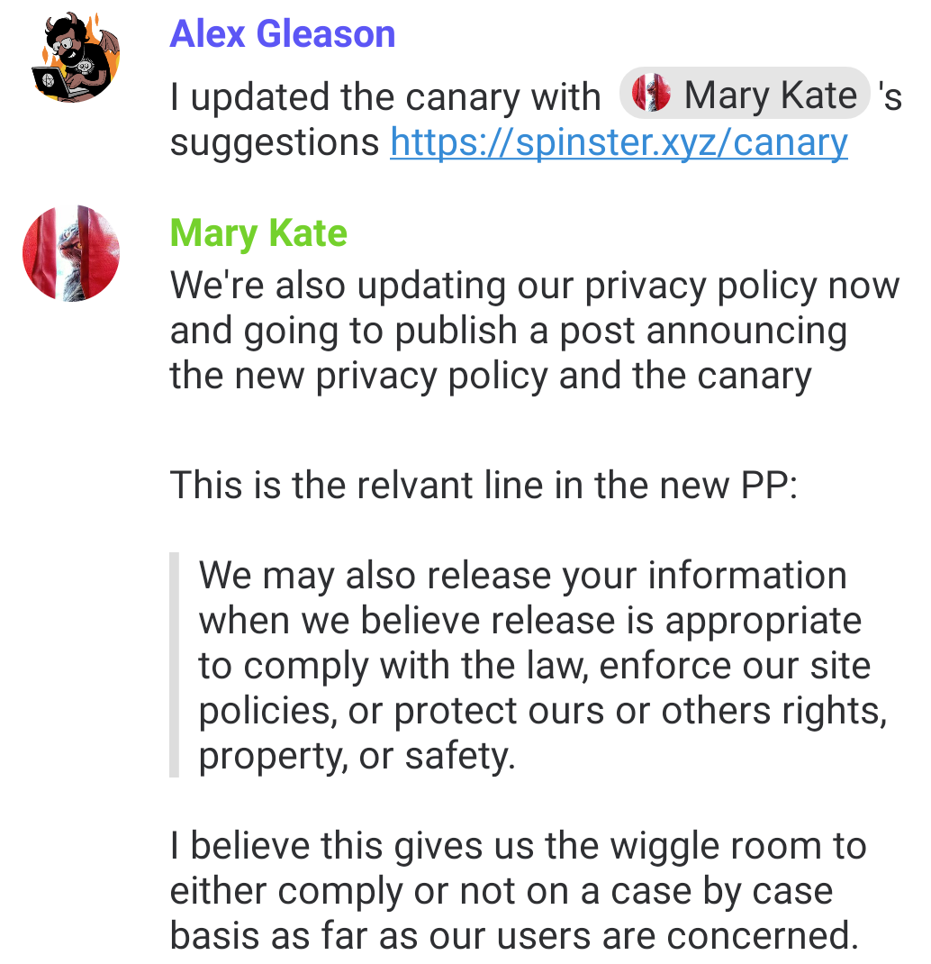 Gleason and M.K. Fain decided to implement a warrant canary they promised users would be updated monthly (receipt 8, 10, 23) after the email was received (https://spinster.xyz/canary, http://archive.ph/LUbvS) and made changes to Spinster.xyz’s privacy policy (receipt 23) (https://web.archive.org/web/20191130191332/https://spinster.xyz/about/privacy, https://spinster.xyz/about/privacy). This action does not appear to be an effort to warn users but rather appears to afford Gleason and Fain more “legal wiggle room” to hand over user data to the feds in certain situations, as evidenced by receipt 23.